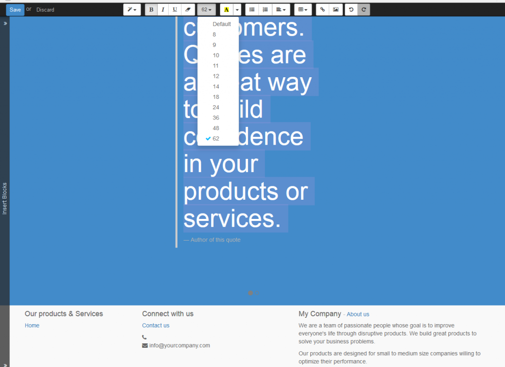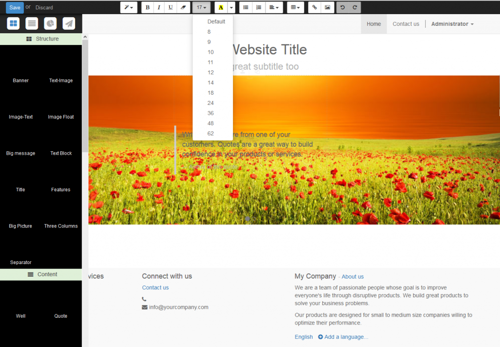 2015年10月20日,发现Odoo9 网站这里改动也蛮多的,有字体大小了(比odoo8更丰富),背景颜色也比8.0多