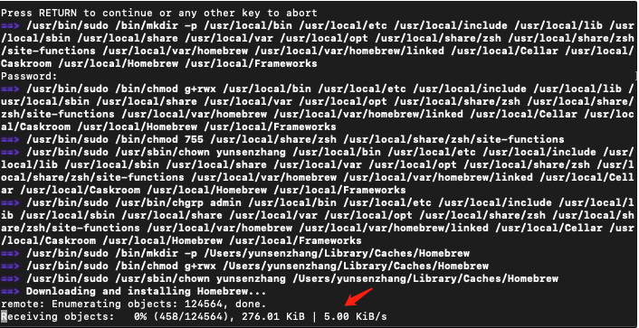 回车后,有一步要输入 当前mac用户的密码,然后开始下载Homebrew