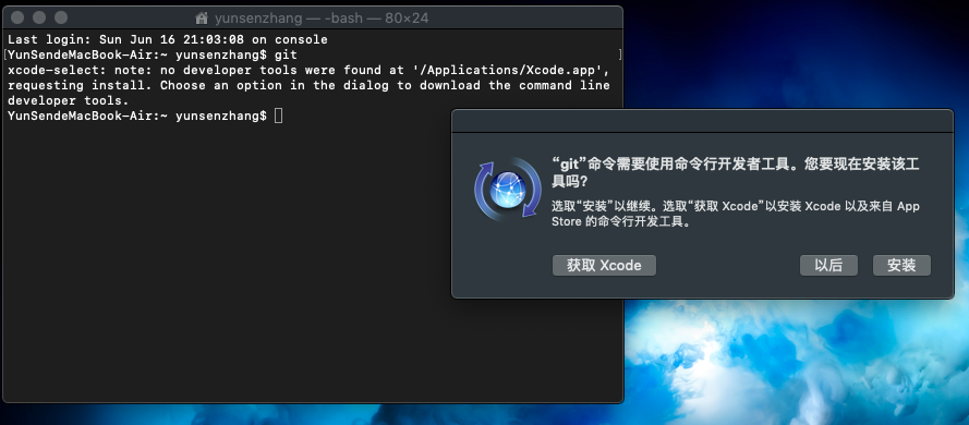 打开mac的Terminal程序,命令行窗口输入git回车,