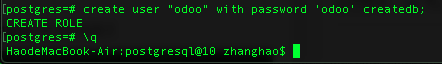 4.5 进入数据库命令行后 ,创建数据库用户odoo和其密码;